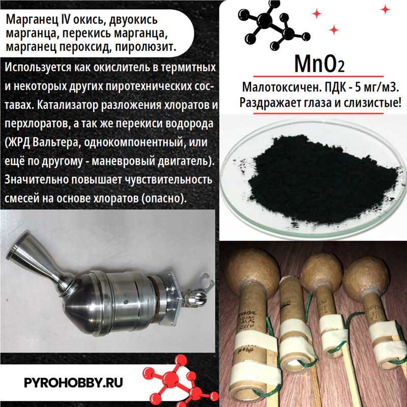 Диоксид марганца довольно серьёзный катализатор для ракетного топлива на ПХА и ПХК. А уж как он разлагает перекись водорода ух. Чёрный мелкодисперсный порошок. Ещё им можно отверждать эпоксидку. Не со всеми пиросоставами дружит, по этому местами он может очень сильно напакостить.