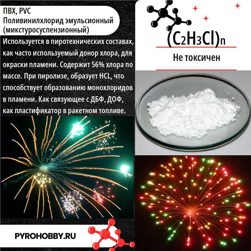 ПВХ в пиротехнике используется в различных цветопламенных составах в качестве донора хлора, раньше – в термопластичных смесевых ракетных топливах.