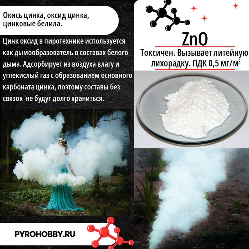 Цинк оксид в пиротехнике используется как дымообразователь в составах белого дыма.